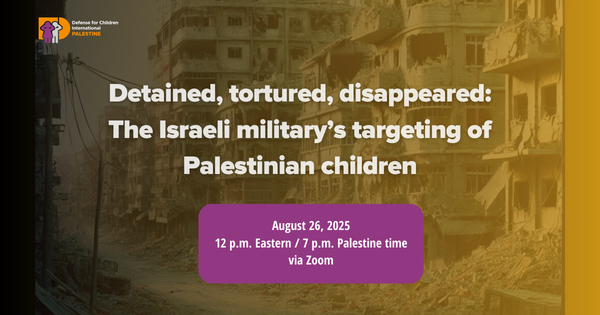 Please join Defense for Children International - Palestine for this webinar at 9 a.m. Pacific / 12 p.m. Eastern / 5 p.m. London / 7 p.m. Jerusalem time on August 26, 2025.